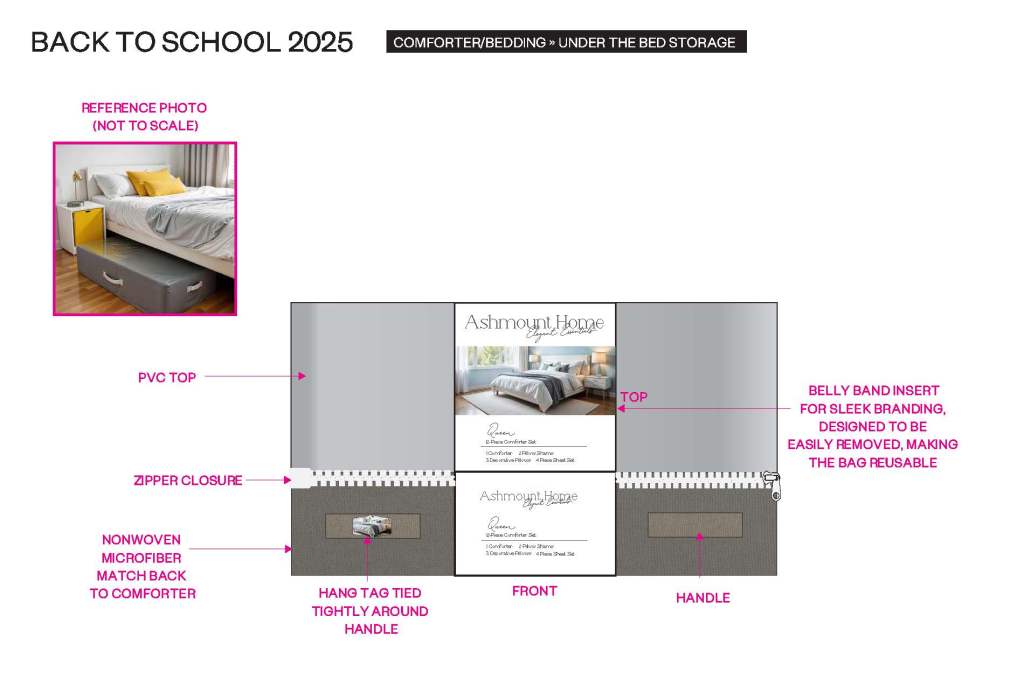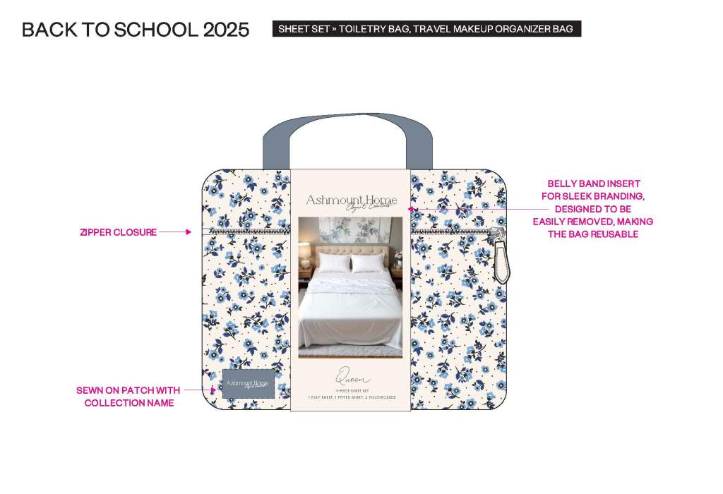 For the Back to School / Back to College season, I developed a multifunctional packaging concept that transforms traditional bedding and sheet set packaging into a reusable, value-added product. Each design focuses on functionality, durability, and convenience for students transitioning into dorm life.