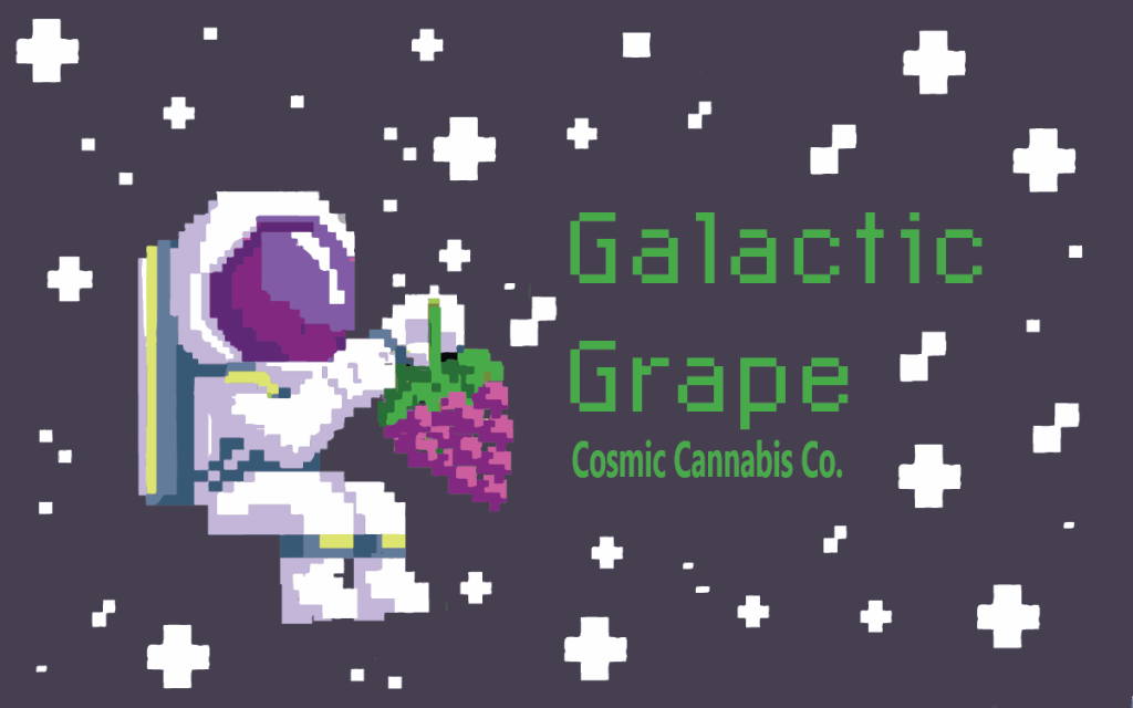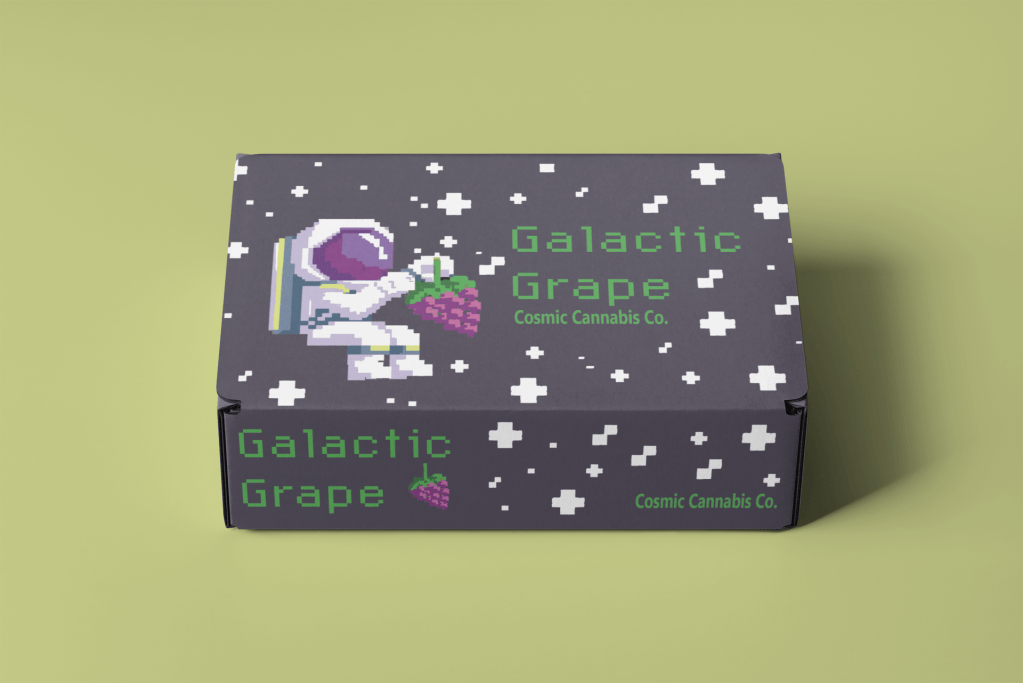 Cosmic Cannabis Co’s Galactic Grape package design features a pixelated astronaut floating in space, holding a bunch of grapes. With its retro-inspired aesthetic and vibrant colors, the box captures the essence of cosmic exploration and the unique flavor of this premium strain