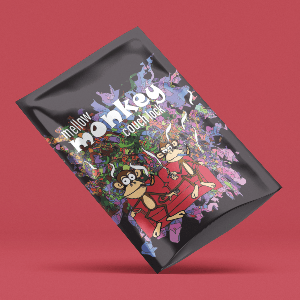 Mellow Monkey’s Couch Lock package design is a psychedelic trip with monkeys. It combines mesmerizing colors and patterns, inviting you to a mind-altering journey. The monkeys lounge in a state of blissful relaxation, harmonizing with the psychedelic vibes. Get ready to join the monkeys on the couch for a transcendent experience of relaxation and euphoria.