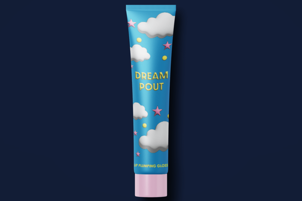 Dream Pout, a plumping lip gloss, comes to life with an imaginative design featuring inflated clouds, visually conveying its volumizing effects. The vibrant, cartoon-like design adds a playful twist, appealing to a dynamic and youthful audience, especially those in their early twenties.