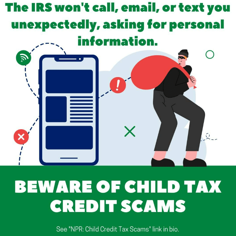 If you get an unexpected call, email, or text from the IRS – or an “urgent” or threatening pre-recorded message – it’s not really the IRS. Avoid Child Tax Credit scams: tap the “NPR: Child Tax Credit Scams” link in our bio for more information.
