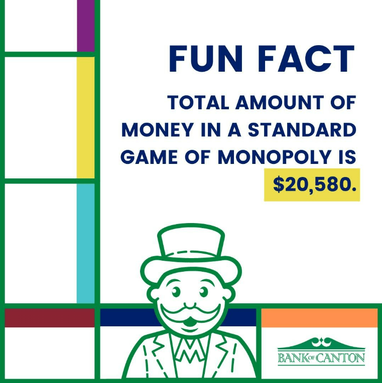 For all you Monopoly bankers out there…. Did you know the standard edition of Monopoly comes with 30 bills of each denomination: $500, $100, $50, $20, $10, $5 and $1? This totals $20,580 per game.